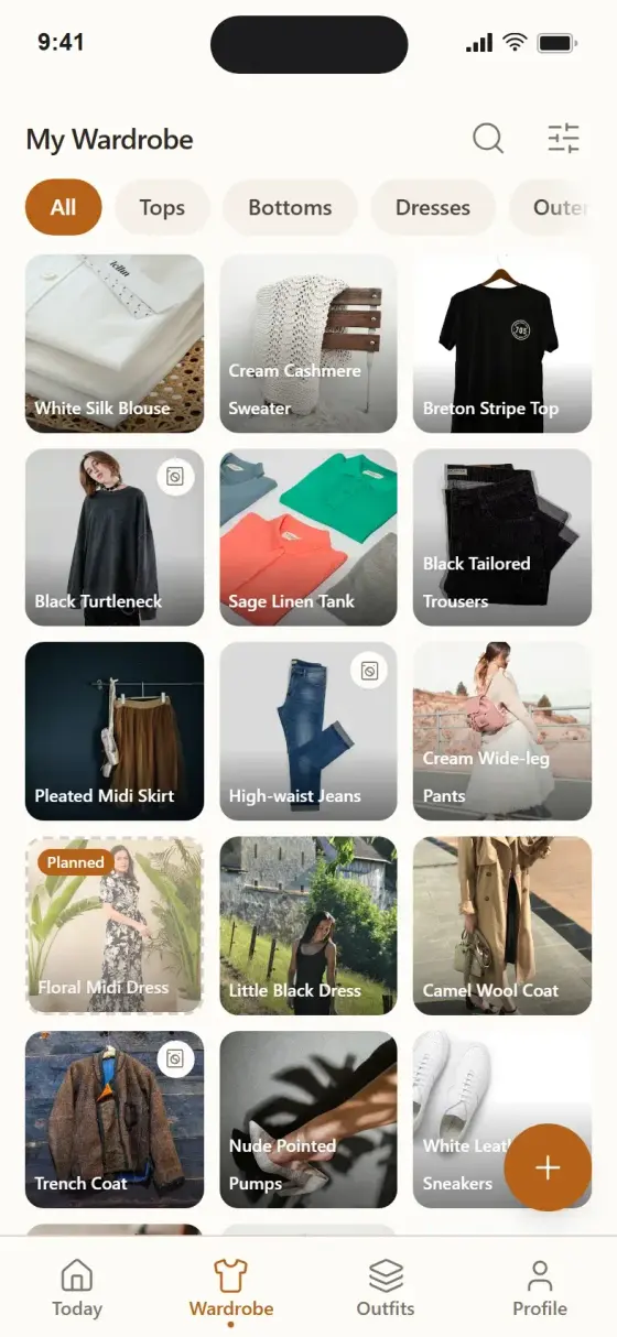 See your full wardrobe in a grid. Filter by type, color, or season. Combine items into outfits, even ones you're planning to buy.